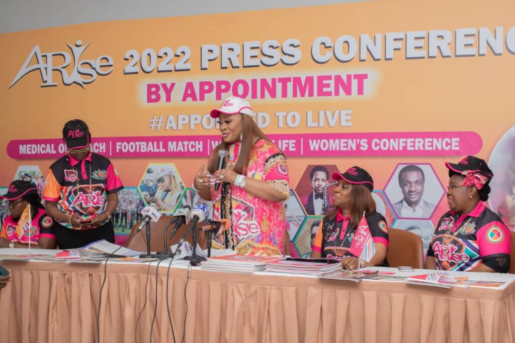 The convener of Arise Walk for Life, Dr. Siju Iluyomade, has the Arise 2022 program borders on its transformational agenda and an ideology of passing on from generation to generation, especially in Nigeria, the essence of life which is good living.With a passion worthy of note, Dr Siju Iluyomade speaking at the press conference to herald this year’s Arise Walk themed By Appointment, with hashtagged, ‘Appointed To Live’, passionately noted that Arise is particular about everyone, regardless of colour, tribe, religion, and is after everyone being clothed, fed and equipped to earn.She said; “We want to increase life expectancy and as such, golfing has been introduced to our activities. As researched, golfers enjoy the privilege of long years.”Arise is interested in preventive health-care, unlike the popular practice of being reactive rather than proactive. She noted that a nation will spend far less money if its people are able to prevent diseases, and as simple as the exercise; walking is, it provides a long list of benefits amongst which are reduction of High blood pressure and anxiety. On the 14th of October, Arise will be having its football match at the Mobolaji Johnson Stadium previously known as Onikan Stadium, and the event will be graced by notable Nigerian football legends like; Daniel Amokachi, Augustine Eguavoen, Samson SiaSia, Uche Okechukwu, Victor Ikpeba, Peter Rufai and sensational striker, Victor Osimhen,Dr. Iluyomade also noted that Arise has enabled Skills Academy that exists to train women to be economically viable.Saying; “It’s time for us to expound a vision. Arise is seen on the SDG goals; attacking poverty; and as the world is speaking sustainability, we shouldn’t go backwards.” She pointed out that Arise was the first and only organization excluding the government that was given the right to vaccinate people, and that came with great sense of honor, working tirelessly with the Isolation Team to ensure that people were not dying. Arise has also worked with influential women to ensure quality education for a huge number of children in Nigeria across Zamfara, Kaduna, etc, under her ADOPT A VILLAGE PROGRAM, with a huge aim which is to provide quality education for every Nigerian child. Noting that a particular community in the North, at a thoughtful request of its leader, Arise built 2 blocks, 16 classes, provided boreholes and a Generator.Arise has her fingerprints all over Nigeria and most especially in states like Abia, Owerri and nearly all Lagos State’s Local Government Areas.While commending her for her unrelenting support, Dr. Iluyomade noted that, Dr Zainab Bagudu, whose educational background is of great asset, is a woman who is alien to the practice of tribalism. Saying, “the minute we erase tribalism and include love, we’d see a greater Nigeria. Nigerians must come together to work for the progress of our people”.”Wherever there is a need, Arise will step in. Asides the Arise Farmers Foundation, which is intended to put workers to work, Arise, has built hospitals in unimaginable places.”To point to the non-denominationalism of Arise, we were at Campus Square Lagos to support the multitude there medically.””Arise was not called upon, but propelled by compassion. A that is why Arise is out to carter for an array of human needs in the area of; Arise insurance scheme, Arise Education, Go back to school, Arise Adopt a Village Program, Arise Farmers Foundation and Arise Vaccination Clinic.”Dr. Iluyomade also noted that Arise foundation will continue to administer its vision, which is that everyone must prosper, everyone must be able to afford good education, access clean water and have food on their table.