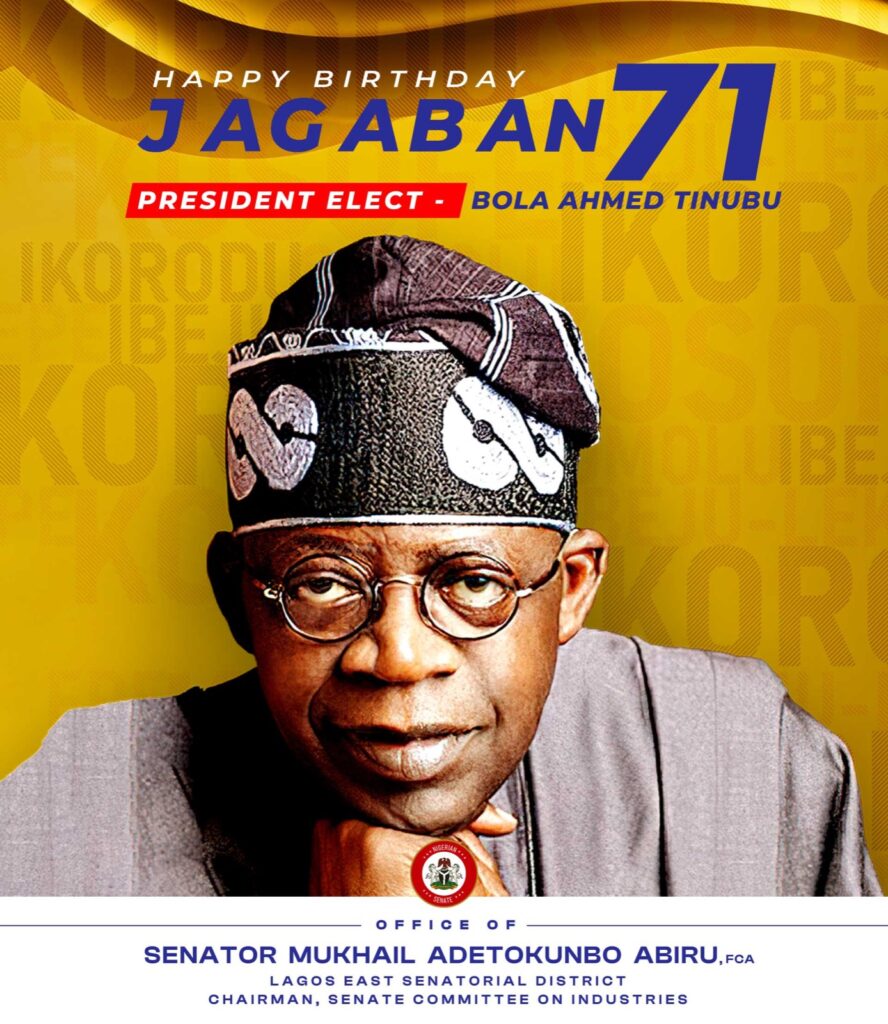 The chairman, Senate Committee on Industries and the Senator representing Lagos East Senatorial District, Senator Mukhail Adetokunbo Abiru, FCA, has congratulated the President-Elect of the Federal Republic of Nigeria, His Excellency, Asiwaju Bola Ahmed Tinubu, on his 71st birthday.