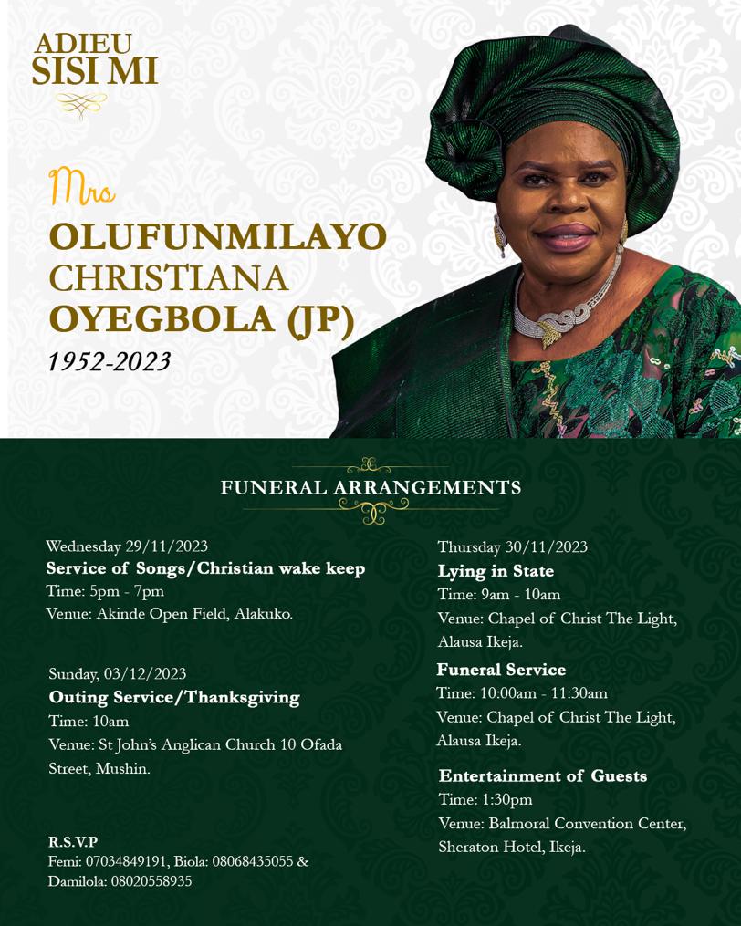 Funeral arrangements have been meticulously planned after seeking counsel and alignment with the Sodipo, Adekanmbi, and Oyegbola families. A lying-in state ceremony is scheduled for November 30, 2023, starting at 9:00 am, followed by a funeral service from 10:00 am to 11:30 am at the Chapel of Christ The Light, Alausa, Ikeja. A reception for guests will take place on the same day from 1:30 pm at Balmoral Convention Center, Sheraton Hotel, Ikeja.