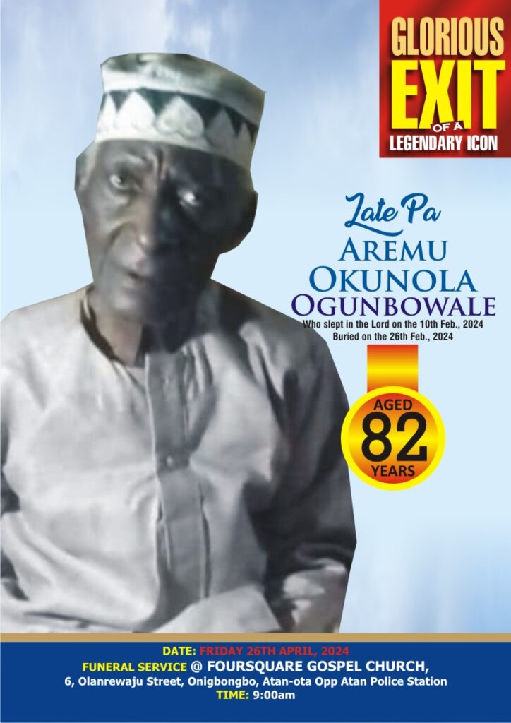 Late Pa Aremu Okunola Ogunbowale will be buried on Friday 26th April 2024 at Atan, Ogun State.