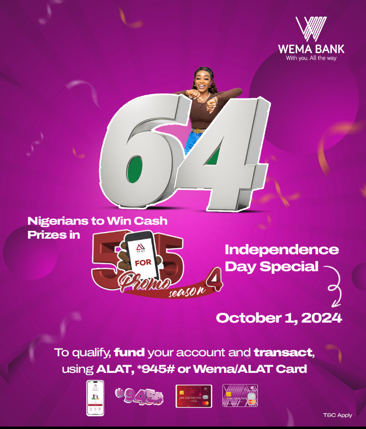 Wema Bank, Nigeria’s foremost innovative bank and pioneer of Africa’s first fully digital bank, ALAT, is set to officially launch the 4th season of its reward initiative, the Wema Bank 5 for 5 Promo, with an Independence Day special live draw targeted at rewarding 64 Nigerians with cash prizes in commemoration of Nigeria at 64 on Tuesday, October 1, 2024.